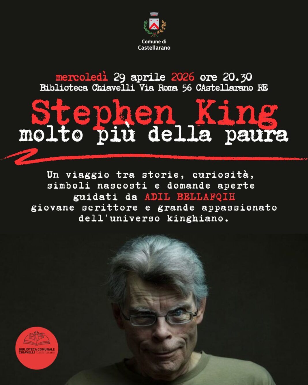 Mercoledì 29 aprile alle 20.30 nei locali della Biblioteca di Castellarano si incontra Stephen King. Il maestro del brivido, autore di innumerevoli best-seller che hanno venduto milioni e milioni di copie in tutto il mondo, è protagonista dell’incontro “Stephen King, molto più della paura” organizzato dalla Biblioteca Chiavelli, che avrà inizio alle 20.30.