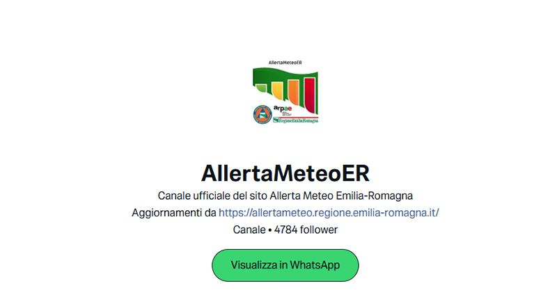AllertaMeteoER ha aperto il proprio canale WhatsApp ulteriore strumento di informazione per amministratori e cittadini, attraverso il quale sarà possibile ricevere aggiornamenti in tempo reale. Si tratta di un ulteriore passo avanti nella comunicazione dell’allerta, che va ad affiancarsi agli altri canali già attivi su Telegram e X, con l’obbiettivo di favorire una sempre maggiore consapevolezza e preparazione dei cittadini rispetto ai rischi meteo, idraulici e idrogeologici.