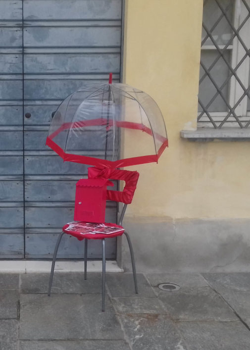 Tra gli appuntamenti una intelligente iniziativa, che va al di là del simbolismo: una sedia, un ombrello ed una cassetta delle lettere in sfolgorante rosso magenta all’interno della quale cassetta donne vittima di violenza, di soprusi, di sopraffazione, di storie da far conoscere, di disamore o di amori meravigliosi potranno lasciare i loro messaggi. Cassette della posta esposte all’esterno del Comune.