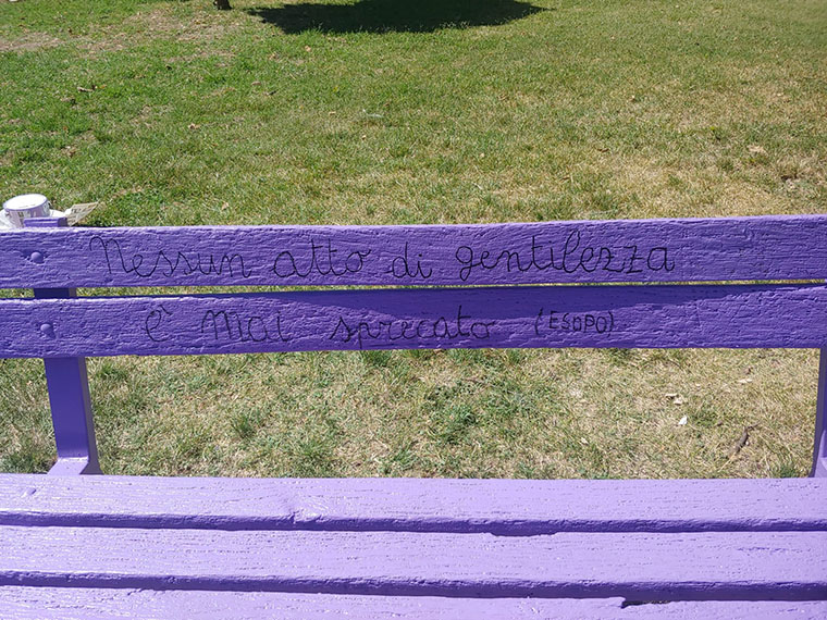 La prima panchina viola, realizzata al Parco del Liofante, riporta la frase di Esopo “Nessun atto di gentilezza è mai sprecato”. La panchina è uno spazio che, comunemente, richiama momenti di incontro ricreativi, di sport, di relax e socializzazione. Il viola è un colore che nasce dall’unione del blu (profondità) e del rosso (concretezza) che identificano la gentilezza.