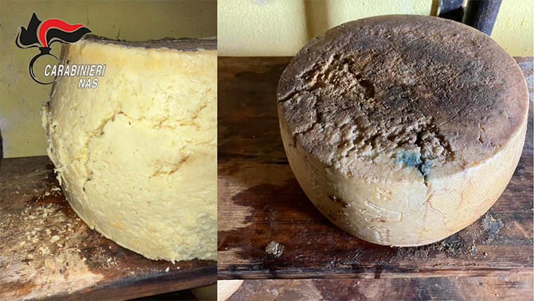 L’ispezione ha rivelato che all’interno del magazzino di stagionatura del caseificio erano stoccate 871 forme di formaggio stagionato a pasta dura e prodotti caseari (siero) in cattivo stato di conservazione. Questi prodotti erano insudiciati, ricoperti da muffa e ragnatele e invasi da parassiti, inclusi larve di insetto ed insetti volanti. Per questo motivo, nel corso dell’attività ispettiva svolta unitamente a personale della locale Azienda U.S.L., è stato eseguito il blocco ufficiale della merce, finalizzato alla valutazione delle condizioni necessarie a destinarla ad uso alimentare umano. Dopo un’attenta valutazione, è emerso che 21 forme grandi, ciascuna con un peso di circa 38 kg, e 4 forme di formaggio più piccole, ciascuna con un peso di circa 4 kg, erano in uno stato di avanzata alterazione e non idonee al consumo umano. Le forme presentavano abbondanti muffe superficiali, ampie e profonde fessurazioni sulla crosta, con fuoriuscita di pasta caseosa rammollita e diffusa infestazione di larve e insetti. Per questo motivo le stesse saranno destinate alla distruzione.