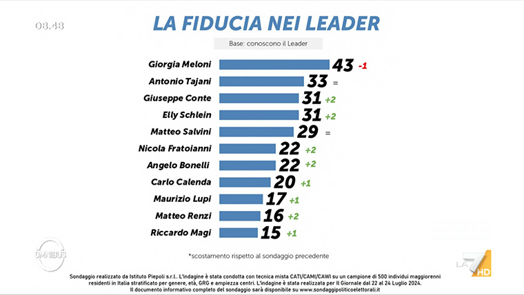 Tra i leader politici Meloni svetta al 43% (in calo di un punto percentuale rispetto al precedente sondaggio).