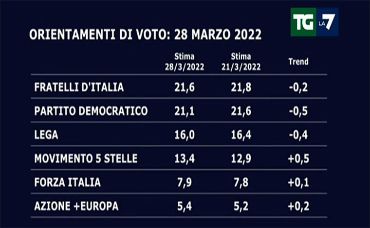 Confermando la Supermedia di AGI e YouTrend anche il sondaggio SWG vede PD e FdI come i due partiti che vedono le preferenze degli italiani e confermano la discesa costante della Lega e il recupero M5S che guadagna mezzo punto e con la fine dello stallo legato alla presidenza del movimento con la conferma di Giuseppe Conte potrebbe riprendere ulteriormente fiato. Continua la lenta ma costante crescita delle federazione Azione + Europa. Più o meno stabili tutti gli altri partiti.