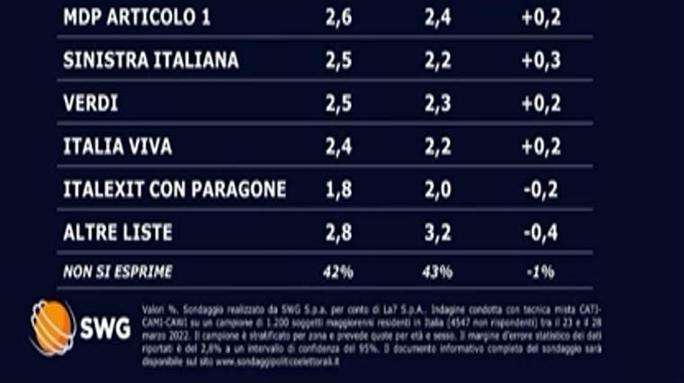 Il sondaggio del lunedì di SWG per il TG La7 di Enrico Mentana vede tutti i grandi partiti in leggera discesa, parliamo dei partiti a due cifre, con il testa a testa tra FdI e PD che continua nelle intenzioni di voto degli Italiani. Non va tenuto in poco conto, anzi è segnale importantissimo, che il 42% degli intervistati non riveli la sua intenzione di voto.