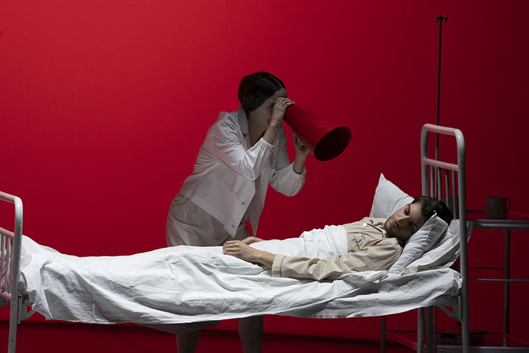 Ecco dunque che la (vera) storia dell’allucinata degenza ospedaliera del compositore Franco Donatoni in Australia di “Alfred, Alfred” viene presentata come prologo onirico, sorta di sogno allucinato del personaggio di Uberto, protagonista della Serva Padrona, in questa messinscena curatore di arte contemporanea ossessionato dalla paura della morte.