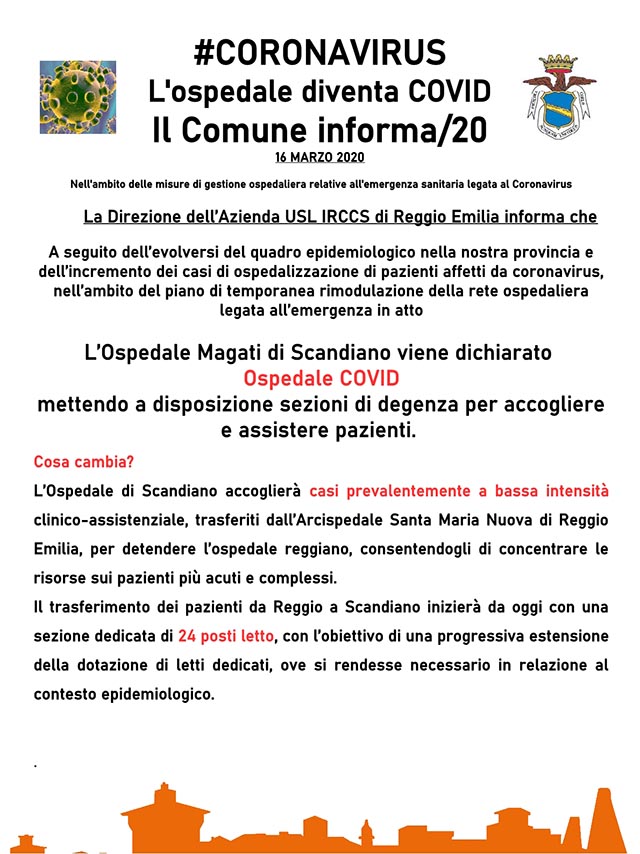 L’Ospedale Magati di Scandiano riceverà, a partire da oggi, una parte dei pazienti affetti da Covid-19 attualmente ospitati dal Santa Maria Nuova di Reggio. Quelli il cui quadro clinico non desta particolare preoccupazione.