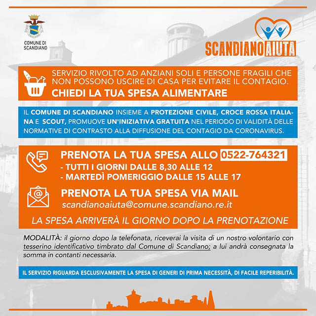 Si chiama Scandiano Aiuta ed è un servizio messo in campo dal Comune di Scandiano a tempo di record insieme a Protezione Civile, Croce Rossa Italiana e Scout per proteggere le persone più a rischio di contagio da Coronavirus, portando loro a casa la spesa alimentare.