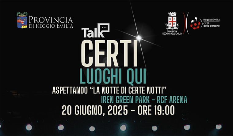 Un’occasione per riflettere – proprio nel cuore dell’RCF Arena, durante La notte di certe notti – sul legame tra la musica e i territori, tra i luoghi pubblici e la voglia di comunità. Si intitola “Certi luoghi, qui” il talk promosso da Provincia e Comune di Reggio Emilia, che si terrà venerdì 20 giugno alle ore 19.00 all’Iren Green Park, sul boulevard dell’Arena, nell’ambito degli eventi collaterali al grande concerto di Luciano Ligabue.
